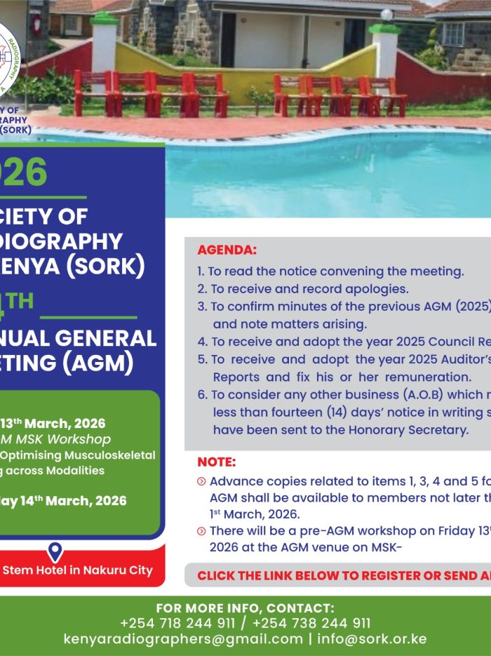 The Society of Radiographers is proud to announce its 64th Annual General Meeting (AGM), set to be held at Stem Hotel in the beautiful city of Nakuru City. This prestigious annual gathering will bring together radiographers, healthcare professionals, policymakers, educators, students, and industry partners from across the country for a day of reflection, strategic planning,...